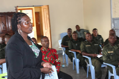 | Mwanasheria kutoka ofisi ya Mkurugenzi wa Mashitaka mkoa Manyara Brandina Msawa akitoa mafunzo kwa askari wa wanyamapori |